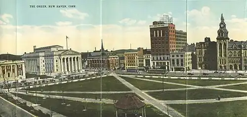An example of a town green is the New Haven Green in New Haven, Connecticut. New Haven was founded by settlers from England and was the first planned city in the United States. Originally used for grazing livestock, the Green dates from the 1630s and now lies at the heart of the city centre.
