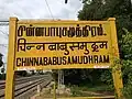 Chinna Babu Samudram station is also located in the Viluppuram district. It was a former customs hub between the former British and French territories.[10] The station has three tracks, with a single side platform serving the southernmost track.