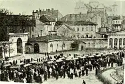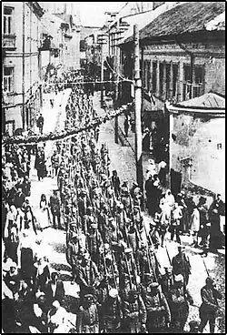 As the Polish troops entered the city, the first pogrom in modern Vilnius started, as noted by the Timothy D. Snyder, citing Michał Pius Römer.[22] Dozens of people connected with the Lit-Bel were arrested, and some were executed; Norman Davies cites a death toll for all – Jews and non-Jews, under Polish rule – as 65.[23] Jews constituted close to one-half of Vilnius's population, according to the German census of 1916,[24] and many victims of fighting and subsequent repression in Vilnius were Jews. Henry Morgenthau, Sr. counted 65,[3] Joseph W. Bendersky counted over a hundred.[25]