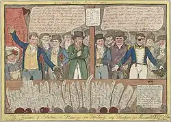 Ultimately Cobbett withdrew before the election and Hunt lost; Cobbett's contemporary biographer Robert Huish claimed that "from the beginning of the meeting to the end it was one tissue of abuse uttered against Hunt and Cobbett [while Figgins and his allies] received from the two sturdy radicals some heavy blows...it is scarcely necessary to remark that neither of the radicals was successful...Mr. Hunt soon saw that he was no great favourite with the good people of that part of the city."[67][g] Figgins came eighth in the poll and was one of the sixteen elected out of eighteen candidates; Hunt came last.[66] Hunt's campaign attracted considerable attention,[70] and a book was published the following year anthologising the events of the campaign "which has excited considerable interest in the public mind of the City."[66]