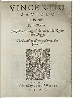 Throughout the 16th century, handbooks became increasingly popular. In 1595, John Wolfe printed Vincentio Saviolo, his practise, in two bookes, the first intreating of the use of the Rapier and Dagger, the second of Honor and honorable quarrels in London. The first part of this work was written as a conversation between Saviolo and an imaginary student (a structure common in 16th-century handbooks). This part undertakes to instruct in the rapier and dagger fencing techniques of Saviolo's day. Saviolo did not teach the lunge, rather recommending circular movement around the opponent in the manner of contemporary Spanish rapier fencers.[6] The second part, Of Honor and Honorable Quarrels, deals with dueling etiquette. Much of the material comes from the works of Girolamo Muzio, written in 1558.[7]