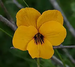 Viola pedunculata, the California golden violet, Johnny jump up, or yellow pansy, is a perennial yellow wildflower of the coast and coastal ranges in California and northwestern Baja California.[3] However, the common name "Johnny jump up" is usually associated with Viola tricolor, an introduced garden annual.
