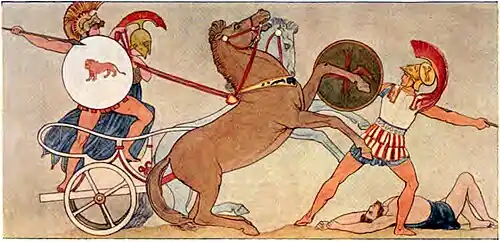 Later epics from different cultures displayed similar, if more magnified, violence to relate their characters' struggles. Homer's Iliad, known approximately 1500 years after Gilgamesh,[5] recounts the ten-year Trojan War with descriptions of one warrior's grisly slaughter after the other. In addition to the graphic imagery, these deaths are often indicated with metaphorical language, such as a darkness setting upon the victim's eyes or pouring about the body. Yet of the most violent features in the epic is Achilles's manhandling of Hector's body in a display of the utter inhumanity of war; it is left to be mauled by dogs and scavenging birds, then stabbed by other Achaeans, only to be, at last, dragged around by his killer's chariot. The suffering, nevertheless, is not only physical but also emotional, an example of which being the psychological torment Helen is subject to as she blames herself for starting the war.[8] This epic's sequel, the Odyssey, does not fall short in its share of violence. During a ten-year journey, the protagonist is forced to witness his men suffer terrible fates as brutal storms are sent their way and they, upon landing on a variety of islands, are attacked by their inhabitants. For example, Sicily's Polyphemus, one-eyed giant son of Poseidon, eats his crew alive – two at a time. Later, cannibalistic Laestrygonians annihilate all the ships save Odysseus's and, landing on Aeaea next, his men are turned to swine by the enchantress Circe.[9]