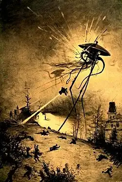 Another genre that grew significantly in this period is science fiction, with authors like Isaac Asimov and Arthur C. Clarke beginning to earn recognition for their work. As it deals with imaginative futuristic scenarios, common themes in science fiction include extraterrestrial discoveries, space wars, time travelling, alternate realities, and technological advancements such as artificial intelligence.[23] Stories of this genre, especially those set in an apocalyptic Earth, depict the extremes of human violence toward nature and themselves. In Ray Bradbury's The Martian Chronicles, human conflict gives rise to a destructive nuclear war that leaves the planet uninhabitable and settlement on Mars a necessity. A similar conflict later arises on that planet, however, leading to the annihilation of Martian civilizations as well. Colonization, environmental destruction, and genocide of innocent nations are human transgressions facilitated by innovations in technology. Violence in these stories often serves to picture the future; with depletion of resources, growing populations, and the advancement of science, human characters are usually written to give in to desperation by letting go of their humanity in a battle for survival of the fittest either against each other or foreign creatures.[24] But by depicting wars between creatures of different race (typically humans versus aliens or robots), science fiction authors assert violence as a truth of life not limited to humans.