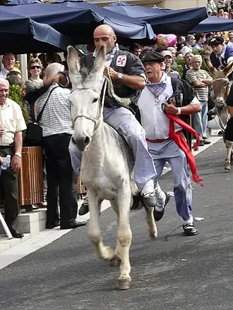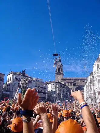 The actual festivity starts at six o'clock in the afternoon with the txupinazo and Celedón's (a rag doll with an umbrella) descent. Once Celedón reaches a balcony in the square, it is replaced by a human Celedón who then crosses the square on foot with some difficulty amongst the crowds. On arriving to the balcony of the Church of San Miguel, Celedón greets the crowds below and wishes everyone a happy celebration. On the morning of 5 August, the Blusas and the Neskak offer flowers to the Virgen Blanca. On 7 August the Children's Day is celebrated. The little Celedón or Celedón txiki descends in the same square as the first day, and later, Celedón txiki and neska txiki wish a happy celebration to all the children in Vitoria, from the Town Hall. On 10 August at one o'clock in the morning Celedón ascends and this marks the end of the Virgen Blanca Festivities.