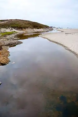 An old haul road, once used for logging and now a pedestrian and bicycle trail, crosses the creek on the west side of California State Route 1, and provides access to the beach at the mouth of the creek.[2][3] The beach is well known as a surf break,[4] with swells up to 6 feet (1.8 m) in both directions.[5] Other beach activities include bird watching and tide pooling at low tide.[6] However pets are not allowed, even on leashes.[7]