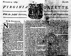 - ^ a b c "Virginia Gazette By Date". Research.history.org. November 5, 2009. Archived from the original on July 24, 2014. Retrieved May 13, 2014.