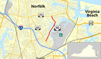 SR 192 begins at an intersection with SR 165 (Military Highway) in the northeastern part of Norfolk. Azalea Garden Road continues southwest as an unnumbered street toward Downtown Norfolk, east of which the highway intersects SR 194, SR 166, and U.S. Route 58. SR 192 heads northeast as a four-lane undivided street through a densely populated residential area. The state highway crosses an arm of Lake Whitehurst before intersecting Norview Avenue, which heads east as the main entrance to Norfolk International Airport. SR 192 passes the entrance to the Norfolk Botanical Garden just before crossing another arm of the lake and veering north. The state highway reaches its northern terminus at SR 170 (Little Creek Road) west of Naval Amphibious Base Little Creek.[1][2]