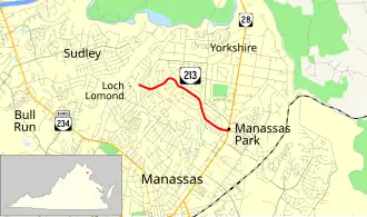 SR 213 begins at the boundary between the city of Manassas Park and Prince William County to the west. Manassas Drive continues west a short distance as SR 1501 to Lomond Drive. The state highway heads east as a two-lane undivided road that winds its way through several residential neighborhoods in the city. SR 213 reaches its eastern terminus at SR 28 (Centreville Road). Manassas Drive continues east as an unnumbered four-lane divided highway that serves the industrial side of town near the Manassas Park Virginia Railway Express station.[1][2]