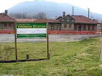 Standing at the division point between the New River Division and the Norfolk Division of the Virginian Railway, construction commenced on the Virginian Station in September 1909 and was complete by early 1910.[5] Measuring 162 feet (49 m) long by 32 feet (9.8 m) wide, the station consists of a pair of one-story buildings, connected by a covered overhang and features a tile roof, a blond brick façade and terrazzo floors.[6][5]