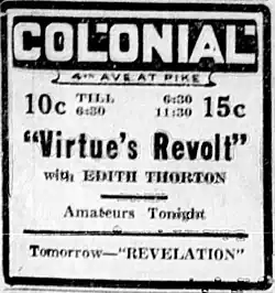 Virtue's Revolt is a 1924 American silent drama film directed by James Chapin and starring Edith Thornton, Crauford Kent and Betty Morrissey.[1]
