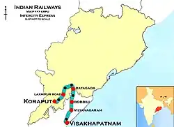 - ^ "18511/Koraput - Vishakapatnam Intercity Express Mail/Express Koraput/KRPU to Visakhapatnam/VSKP - India Rail Info - A Busy Junction for Travellers & Rail Enthusiasts". India Rail Info. 23 March 2012. Retrieved 30 October 2013.