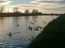 In the autumn of 2010 a flock of 30 swans landed on the Vizelj and have been coming every years since then, and the number of swans doubled. They became a local attraction.[11][8] However, the area was plagued by the avian influenza in January 2017, which killed almost 40 swans.[19] Further deaths of dozens of swans from avian influenza were recorded in 2021, 2022,[20] and 2023.[21][22] As in 2023 the isolated strains included those which are almost 100% fatal for poultry, and can be transferred to mammals and humans, the contagion zone was declared around the stream in October 2023, 10 km (6.2 mi) from the outbreak point, and 3 km (1.9 mi) wide.[23][24]