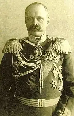 In 1913 he was appointed First Deputy Interior Minister, head of the Okhrana and purified the police.[2] When he discovered that Roman Malinovsky, who headed the Bolshevik delegation in the Fourth Duma, was also a highly paid police agent, he decided that the risk of a scandal was too great, and ordered that Malinovsky had to quit and leave Russia.[3] Two years later, in June 1915 he was responsible for a report on the drunk Grigori Rasputin after the alleged incident in the Yar restaurant in March. Besides Dzhunkovsky failed to get his hands on a manuscript written by Iliodor.[4] On August 19, 1915, he was discharged from most of his posts. Stepan Beletsky became his successor. In January 1916 Dzhunkovsky was sent to Siberia where he commanded the 15th Siberian Rifle Division on the Western Front (Russian Empire). In April, 1917 he gained the rank of General-Lieutenant; in September he commanded the 3rd Siberian Army Corps.