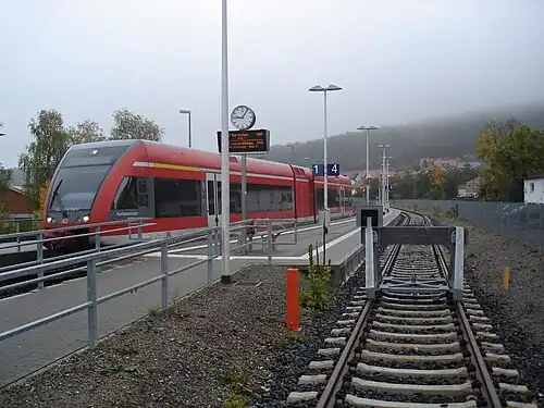From 2010 onwards, the railway line between Wolfhagen and Vellmar was upgraded. This allowed a half-hourly service to Zierenberg to be introduced on 15 December 2013 for the 2013/2014 timetable change.[5] With the new RegioTram concept, the timetable on the line was completely redesigned. The RE services have different departure times and the travel time to Korbach has been reduced by ten minutes. In Zierenberg, the line offers short transfer times to the RegioTram to Kassel Hauptbahnhof and Kassel city centre.