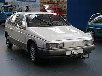 The three-door hatchback used the chassis of the Volkswagen Golf Mk1 and was of a particular design, with a tall kammback rear end and a front without a traditional grille. Wind resistance was Cd=0.25.[2] Smaller details such as the integrated drip rails (which also hid a welding seam) quickly made their way onto the Golf Mk2. Volkswagen had considered using the Auto 2000's front design on the new Golf, but in the end they decided on a more conventional front for what has long been their most important product.[3] The Auto 2000 front end instead wound up on the Passat B3 in 1988. To save weight, the car used a number of parts made from composite materials, including a plastic rear axle.