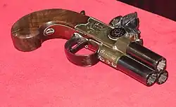 A few hand-held volley guns were also developed during the 18th and 19th centuries. One of the most distinctive was the "duck's foot" volley gun, a pistol with multiple barrels arranged in a splayed pattern, so that the firer could spray a sizable area with a single shot.[9] The principle behind this type of pistol is one of confrontation by one person against a group; hence, it was popular among bank guards, prison wardens and sea captains in the early 19th century.[10][11]