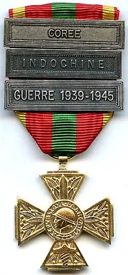 The Volunteer combatant's cross (French: "Croix du combattant volontaire") was a French decoration that originally recognized those who volunteered to serve in a combat unit during World War II. It is the equivalent of the "1914–1918 Volunteer combatant's cross" (French: "Croix du Combattant Volontaire 1914–1918").