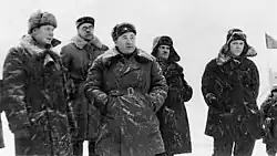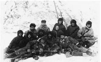 The first train arrived at Vorkuta on 28 December 1941. This important event was attended by residents of Vorkuta and photographed by Yakov Yakovlevich Fomin, who was in charge of constructing the railway. From 1939, Polish prisoners were held at Vorkuta following the Occupation of Poland[9] until the German invasion of the Soviet Union in 1941.[10] Vorkuta was then also used to hold German prisoners of war captured on the Eastern Front in World War II as well as criminals,[11] Soviet citizens and those from Soviet-allied countries deemed to be dissidents and enemies of the state. US soldiers were also held in the camp, a majority of whom were captured during the Korean War.[12] Many prisoners did not survive their internment and died by freezing to death in the cold climate, starvation (food was scarce) or being worked to death. Prisoners were fed rye bread, buckwheat, meat, fish and potatoes but in very small amounts. Prisoners resorted to killing rats or stray dogs for food. Self-harm was common in the camp: if an inmate sustained an injury they would be sent to the hospital where conditions were better. The average amount of working time in the camp was 16 hours a day for every inmate.[13] The guards who protected and managed the Gulag were a part of the NKVD, MVD and the Red Army. Guards were most often recruited on three-year contracts after completing their basic military service. Regulations allowed guards to shoot without warning any prisoner who strayed outside the designated work zone or too near a camp fence.[14]