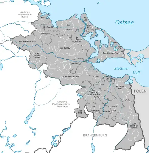 Vorpommern-Greifswald is a district in the east of Mecklenburg-Vorpommern, Germany. It is bounded by (from the west and clockwise) the districts of Mecklenburgische Seenplatte and Vorpommern-Rügen, the Baltic Sea, Poland (West Pomeranian Voivodeship) and the state of Brandenburg. The district seat is the University and Hanseatic City of Greifswald.[2] A lake called Berliner See is found in the district.
