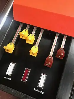 The Vox Continental uses six slider-type, metered volume controls called drawbars instead of the stop-tab rocker switches seen on other combo organs. Two of the drawbars on the right hand side control the voices (flute and reed tones), while the four on the left control the footages (corresponding to ranks of pipes on a pipe organ). The stock Continental has 16', 8' and 4' drawbars, with a fourth one labelled "IV" containing a mixture of higher pitches.[5] There is a single-speed, single intensity vibrato whose rate can only be adjusted by removing the lid of the instrument and adjusting a potentiometer[a]. The Continental has no other internal effects.[7] A bass pedalboard was available as an optional extra.[8]