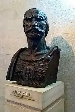 Vrana (d. 1458), historically known as Vrana Konti (literally, Count Vrana) was an Albanian military leader who was distinguished in the Albanian-Ottoman Wars as one of the commanders of Gjergj Kastrioti Skanderbeg, of whom he was one of the closest councillors. He probably belonged to the class of small lords who were tied to the Kastrioti family and possibly belonged to a common lineage (fis) with them. In his youth, he fought as a mercenary in the armies of Alfonso the Magnanimous. The term conte ("count") with which he became known in historical accounts didn't refer to an actual title he held, but to his status as a figure of importance.
