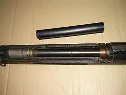The vz. 52 is a shoulder-fired semi-automatic rifle with a tilting-bolt locking mechanism powered by an annular short-stroke gas piston system. The bolt is locked by two lugs that recess into slots machined into the receiver. However, unlike most vertically-locking breech mechanism, the rifle's bolt has the unusual feature of tipping the bolt frontally to lock the mechanism, whereas other tipping bolt designs tip the bolt to the rear.[8] The piston is actuated by residual gases from the bore, vented into a sleeve surrounding the barrel to overcome the inertia of the bolt carrier, bolt and the resistance of the return spring in order to unlock the chamber, eject the empty cartridge casing and then introduce a new round into the chamber upon return to battery.