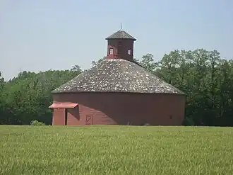 The W. H. York Round Barn, also known as Thompson Barn, is a historic round barn located on Country Road 249 (CR-249) a half mile south of Lodi, in Liberty Township, Parke County, Indiana. It was built about 1895, and is a two-level wood-frame structure on a brick foundation. The barn measures 56 feet in diameter. It has a conical roof topped by a circular cupola.[2]: 5