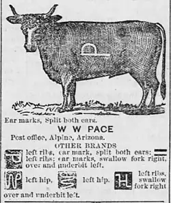 William W. Pace was born June 8, 1857, in Spanish Fork, Utah,[2][3] and was later a cattleman in Nutrioso, Arizona.[4] He married Catherine on January 29, 1879, in Salt Lake City, and a year later moved from there to Nutrioso in a wagon train. The couple would have 7 sons and 2 daughters. Catherine's family had immigrated from Scotland in 1860 aboard the sailing ship, The Underwriter, in a voyage which lasted 11 weeks. They immediately headed to Salt Lake City, arriving there on September 2, 1860, and Catherine was born weeks later on September 15.[5] In 1901, Pace and several partners, purchased several mercantile businesses and consolidated them into the Thatcher Implement and Mercantile Co., which flourished.[6][7] Pace was also part of a group who, in 1907, forming the Co-Operative Ice & Creamery Co., a dairy company serving the Globe, Arizona area.[8][9] Pace also served on the board of trustees and as vice-president of The Graham County State Bank.[10]