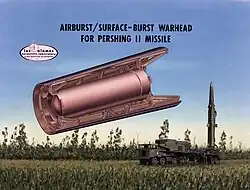 The Pershing Ia missile was armed with a 400 kilotonnes of TNT (1,700 TJ) W50 warhead. By the early 1970s, it was clear that this was far too large to allow the missile to be used as a tactical nuclear weapon—at the time, 400 kilotons was larger than many strategic warheads. The Pershing II had a high-accuracy maneuverable reentry vehicle (MARV) equipped with a radar terminal guidance system, which allowed it to use the lower-yield W85 warhead. This warhead was derived from the B61 Mod 3 and utilized the same pit in the primary stage of the warhead,[4] but it has also been described as having a nuclear design similar to that of the B61-4.[5] The total weight of the Pershing II warhead section was 591 pounds (268 kg), which included the reentry vehicle.[6]