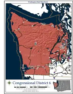 Washington's 6th congressional district encompasses the Olympic Peninsula, the Kitsap Peninsula, and most of the city of Tacoma. Its counties include the entirety of Clallam, Kitsap, Mason, Jefferson, and Grays Harbor counties, and part of Pierce County. The 6th district has been represented in the U.S. House of Representatives by Emily Randall, a Democrat from Bremerton, since January 2025.