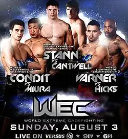 WEC 35: Condit vs. Miura was a mixed martial arts event held by World Extreme Cagefighting that took place on August 3, 2008 at the Hard Rock Hotel and Casino in Paradise, Nevada. The event drew an estimated 423,000 viewers on Versus.[1] The event featured three title fights, the first time a Zuffa, LLC promoted MMA card featured more than two title fights on the same card since UFC 33 in 2001; there would not be another UFC event with more than two until UFC 205 in 2016, after Zuffa had sold the promotion.