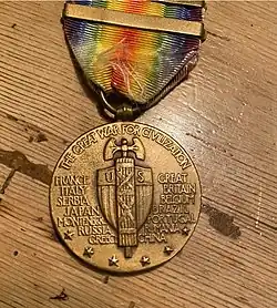 The World War I Victory Medal (known prior to establishment of the World War II Victory Medal in 1945 simply as the Victory Medal) was a United States service medal designed by James Earle Fraser of New York City under the direction of the Commission of Fine Arts.[1]