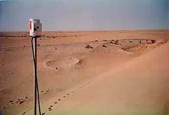 In 1994 and 1995, a total of three expeditions were undertaken, sponsored by the Zahid Tractor Corporation. A United States Geological Survey scientist, Jeffrey C. Wynn, joined all three expeditions, and astronomer and geologist Gene Shoemaker joined at least one.[8] These expeditions were made with modern off-road vehicles, but even with modern technology, the trips were difficult ones. Not only were conditions harsh, but the Wabar site was tricky to find, as it sits in the midst of an enormous dune field that has no fixed landmarks.
