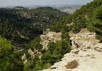 Planted with forest trees such as cypress, Aleppo pine, oak, swede, tamarisk, carob, and Palestinian terebinth.[3]