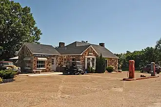 The original buildings were constructed using local Ozark sandstone and designed in the Tudor Revival style by stonemason and builder Leo Friesenhan. Original owners Margaret and Robert Martin ran the motel until 1946, by which time the accommodations had been expanded, converting garages to motel units and bringing the site up to fourteen rooms. The filling station was leased to Marathon Oil Company from 1936 to 1941 and operated by Joe and Clara Slowensky.[1]