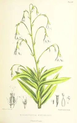 Wahlenbergia roxburghii, the Roxburgh bellflower or dwarf cabbage tree, is an extinct member of a group of four species of Wahlenbergia once known from the island of Saint Helena, in the South Atlantic Ocean. It was last seen by naturalist John Charles Melliss in 1872. William Roxburgh recorded it in the thick forests on the south face of Diana's Peak. De Candolle notes it in dense woods around Diana's Peak and Halley's Mount. Burchell notes it 'On Sandy Bay ridge near Taylor's. Flowering: probably August to March. It was exceedingly rare in Meliss's time, it is not in his book as he had not found it. It was probably the increase of Phormium tenax planting on the ridge that pushed Wahlenbergia roxburghii into final extinction. It is an example of one of the early extinctions of Saint Helena plants as a result of human activity, with a history similar to that of the stringwood (Acalypha rubrinervis), (see List of extinct plants).