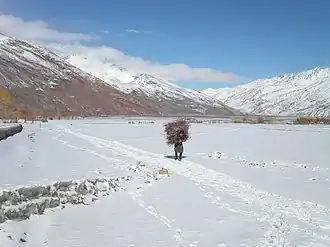 Wakhan is sparsely populated. The total population is estimated at 10,600.[15] Wakhi and Kyrgyz are the major ethnic groups of Wakhan. Most of its inhabitants speak the Vakhi or Wakhi language (x̌ik zik), and belong to an ethnic group known as Vakhi or Wakhi. Nomadic Kyrgyz herders live at the higher altitudes.[17]
