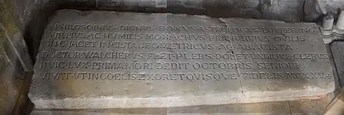 "In this chest lies Doctor Walcher, a worthy philosopher, a good astronomer, a Lotharingian, a pious and humble man, a monk, the prior of his sheepfold, a geometer and abacist. The people mourn, the clergy grieve on all sides. The first day of October brought death to this elderly man. May each believer pray that he may live in heaven. 1135."[10]