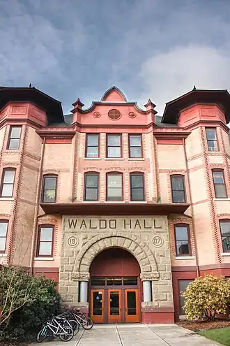 Waldo Hall was named in 1907 for Clara H. Waldo, the wife of pioneer and Oregon supreme court judge John B. Waldo.[4] She served on OSU's board of regents and was the first woman in the U.S. to serve on the board of a state college.[4] She was also the first woman to address an OSU graduation class.[4]
