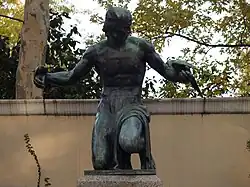 Hancock's first major commission was the Jessie Tennille Maschmeyer Memorial Fountain (1931–32) for the St. Louis Zoo.[14] A drinking fountain featuring a pedestal flanked by twin basins, the severe Art Deco-Pueblo architecture of its granite base served as inspiration for Hancock's central figure, a Zuni Bird Charmer.[5]: 21 The larger-than-life-sized figure of a loin-clothed kneeling man with a bird perched on each wrist, won Hancock PAFA's 1932 Fellowship Prize.[6]: 279 The fountain is located beside the east entrance to the zoo's Bird House.[15]