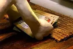 Gromit is a dog, with a cream-coloured short-hair coat and oversized floppy dark brown ears, who is Wallace's pet and best friend.[31] He is very intelligent, having graduated from "Dogwarts University" ("Dogwarts" being a pun on "Hogwarts", the wizard school from the Harry Potter books) with a double first in Engineering for Dogs.[32] He likes knitting, playing chess, reading the newspaper, tea and cooking. His prized possessions include his alarm clock, dog bone, brush, and a framed photo of himself with Wallace. He is very handy with electronic equipment and an excellent aeroplane pilot. He often threatens the plans of the antagonists he and Wallace encounter in their adventures. Sometimes, Gromit ignores Wallace's orders, such as in A Close Shave and Shopper 13, where Wallace orders him to get rid of Shaun but Gromit does not. Gromit's birthday is 12 February.[33] In The Wrong Trousers, he is seen circling the date on a calendar.