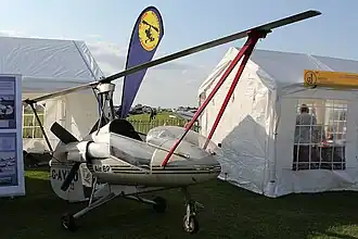 Following on from his family of single-seat autogyros former Royal Air Force aviator Wing Commander Ken Wallis developed a high-performance long-range variant with an enclosed cockpit. The WA-120, registered G-AYVO, was first flown on 13 June 1971.[1] The autogyro is powered by a 130 hp (97 kW) Rolls-Royce Continental O-240-A piston engine driving a four-bladed pusher propeller.[1]