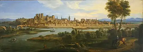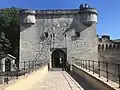 In the first half of the 16th century the crumbling towers were repaired and between 1524 and 1538 extra loopholes were pierced for the newly acquired cannons.[20] In 1561 Pope Pius IV sent his cousin, Fabrizio Serbelloni, to organise the defence of the town against the Huguenots during the French Wars of Religion (1562–1598).[43][44] The walls were repaired, and three of the gates were walled up. These were Porte Saint-Roch, Porte de l'Oulle and Porte de la Ligne. The remaining four gates were strengthened by the addition of protective fortifications (ravelins) outside the gates themselves.[45][46]