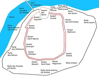 - ^ For four of the twelve entrances the surviving manuscripts only ever mention a single gate. These are: Portail Pertuis, Portail Saint-Agricol, Portail l'Évêque, and Portail Aurose.[9]