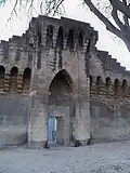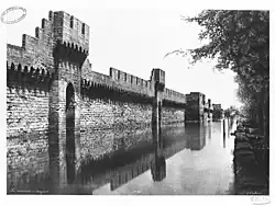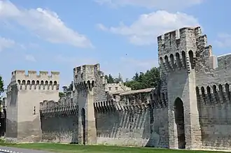 The new suburbs were protected with temporary wooden structures while the stone walls were being built.[32][33][34] Limestone for the walls and towers came from a quarry on the other side of the Rhône above Villeneuve-lès-Avignon, wood came from Savoy, lime for the mortar came from Villeneuve-lès-Avignon and sand came from islands in the Rhône.[35] By 1372 the new walls were sufficiently advanced to protect the town against a band of mercenaries en route to Italy.[36][34] Work continued and in 1381 the merlons near the Dominican monastery (Porte des Prêcheurs) were rebuilt.[20]
