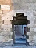 In the 18th century the walls continued to be maintained up to the time of the French Revolution and three of the seven gates were rebuilt. The Porte de la Ligne at the north of the town was judged to be too narrow. In 1755–1757 a new gatehouse designed by the architect Jean-Pierre Franque was built 50 metres west of the old gate at the end of Rue Palapharnerie. The new gate replaced a small tower. The old gatehouse was demolished and replaced by another small tower.[47][48] In 1760 the Porte du Rhône, to the south of the Saint-Bénézet bridge, was demolished and rebuilt in a classical style. The new gate was again designed by Franque.[49] In 1783 the Porte de l'Oulle, to the west side of the town, was demolished and rebuilt 20 metres to the north of its original position, opposite La Comédie theatre on the other side of the Place Crillon. Vestiges of the arch of the original gate are still visible on the interior surface of the wall. The design was by the architect Jean-Baptiste Péru. The new gate no longer survives: it was demolished in 1900.[50] During this period the battlements were repaired between Porte Saint Roch and Porte d'Oulle as well as between Porte de la Ligne and Porte Saint-Lazare.[45]