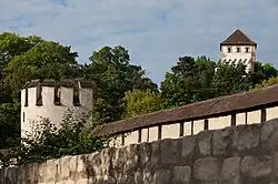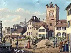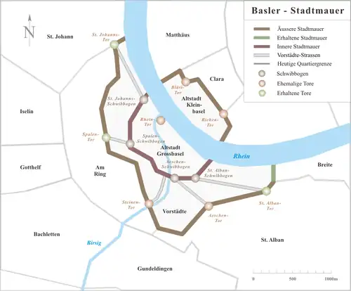At the end of the 11th century, the growing settlement in the valley was walled, though settlement continued outside the wall.[1] As the town spread up the west slopes surrounding the Birsig river, that section was walled also.[1] At the beginning of the 13th century, all these sections were included within a single wall that embraced both the valley and hill settlements. In 1362, the city began building a new, wider city wall, which also enclosed the suburbs. It is possible that the destruction wrought by the earthquake of 1356 contributed to the decision to build a new wall. Among the construction materials were debris from the destruction and Jewish gravestones from the cemetery of the first Jewish community of Basel,[2] which was destroyed in the violence surrounding the outbreak of the Black Death in 1348. The construction of the outer city walls was completed in 1398 and these walls lasted until the mid-nineteenth century.[1]