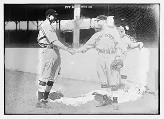 On July 26, 1922, Pipp bobbled a ball during the fifth inning of a game against the St. Louis Browns. When the Yankees returned to the dugout, Ruth criticized Pipp's fielding. Pipp attacked Ruth, and the two were separated by teammates. Though Ruth insisted they'd "settle this after the game", Ruth and Pipp led the Yankees to a victory with their hitting, and when Pipp approached Ruth after the game, ready to fight, Ruth opted against it. Pipp said this resulted in reduced tension among the Yankees, to which he attributed their improved play from that point forward.[7] Pipp batted .329 in 1922 and the Yankees again won the American League pennant.[7] In a rematch, the Giants again defeated the Yankees in the 1922 World Series.[12] Meanwhile, Pipp scouted Lou Gehrig, who was playing college baseball for Columbia University, and suggested to Miller Huggins, the Yankees' manager, that he should sign Gehrig. Pipp personally helped develop Gehrig after he signed.[13] Pipp had a strong 1923 season, but injured his right ankle while stepping down from a train in Boston late in the year. The Yankees used Gehrig, whom they promoted from the minor leagues, to play in four games at first base replacing Pipp,[7] before calling upon Babe Ruth to substitute at first base for the four games at the very end of the season.[14] Though Huggins initially thought Pipp would not be able to play in the 1923 World Series,[15] Pipp recovered sufficiently in time to play.[16] The Yankees won the series in six games over the Giants.[7][17] The Yankees finished in second place in the American League in 1924,[7] and Pipp led the league with 114 RBIs and 19 triples.[18]