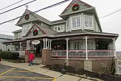 Beginning in the 1990s business leaders developed Walnut Creek into an American-Victorian themed town, which the University of Dayton's Susan Trollinger calls "puzzling" because of the stark contrast between Victorian overdecorating and the Amish plainness.[6]: 49–50 Tourist-oriented businesses typically include "resting places" such as parlors in hotels or wrapround porches lined with rocking chairs or other seating on retail shops, which emphasizes a sense of having plentiful time.[6]: 57 Her conclusion is that the Victorian theme and emphasis on resting places is capitalizing on the attraction of nostalgia for a simpler life with plentiful time, which it has in common with the Amish.[6]: 51–60 Large parking lots and sidewalks connect the business district, which is condensed into six square blocks and connected by wide sidewalks, further encouraging a feeling of a slower-pace and life lived on foot.[6]: 59 American flags and other patriotic-themed decor are commonly displayed in both exterior and interior spaces, which Trollinger again finds interesting when contrasted to the Amish, who refuse to recite the Pledge of Allegiance and do not fly flags at their schools and homes.[6]: 70